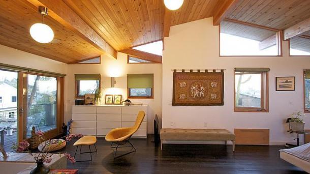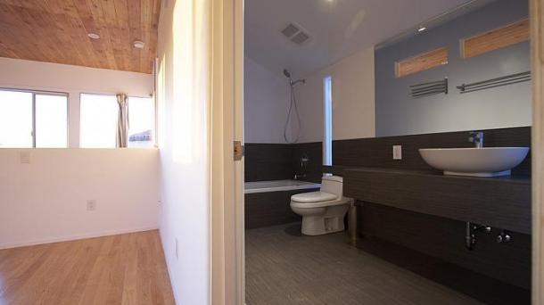 This apartment with nice shades of blue and a beautiful bathroom will help you to relax after work.